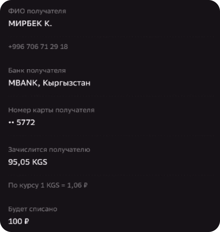 Пользователю необходимо выбрать страну и способ зачисления (в нашем случае это Кыргызстан и перевод по номеру телефона) и вставить скопированный номер телефона